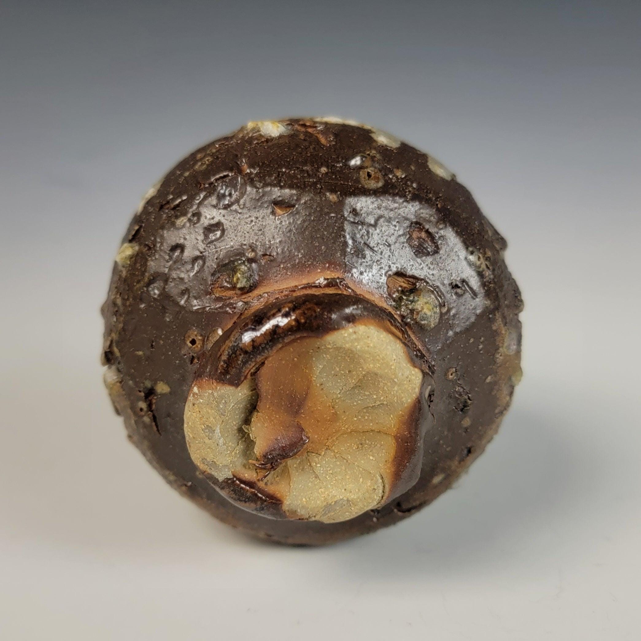 The clay body is a custom, high-fire blend featuring inclusions of hand-processed granite. These minerals melt and react during the 5-day firing, creating a rugged, primitive surface that feels geological in the hand. The natural ash glaze and deep iron-rich scorch marks are "painted" by the path of the flame as it moved through the kiln and where the wood ash was deposited.